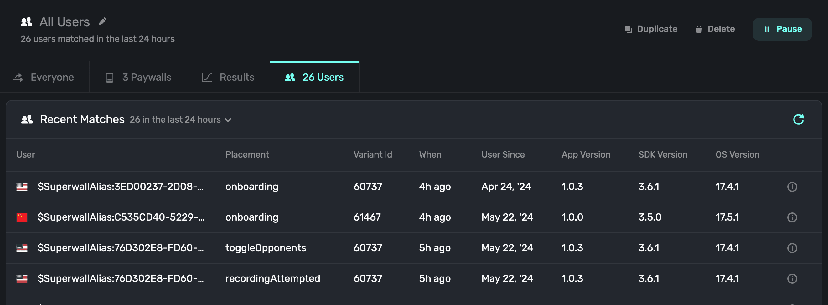 Audiences allow you to set up simple or complex filtering rules to match certain users and show a paywall to them. For a user to see a paywall, they must be matched to an audience. An audience can show one or more paywalls based on a percentage you set (i.e. show paywall A to 70% of users, and paywall B to 30%).