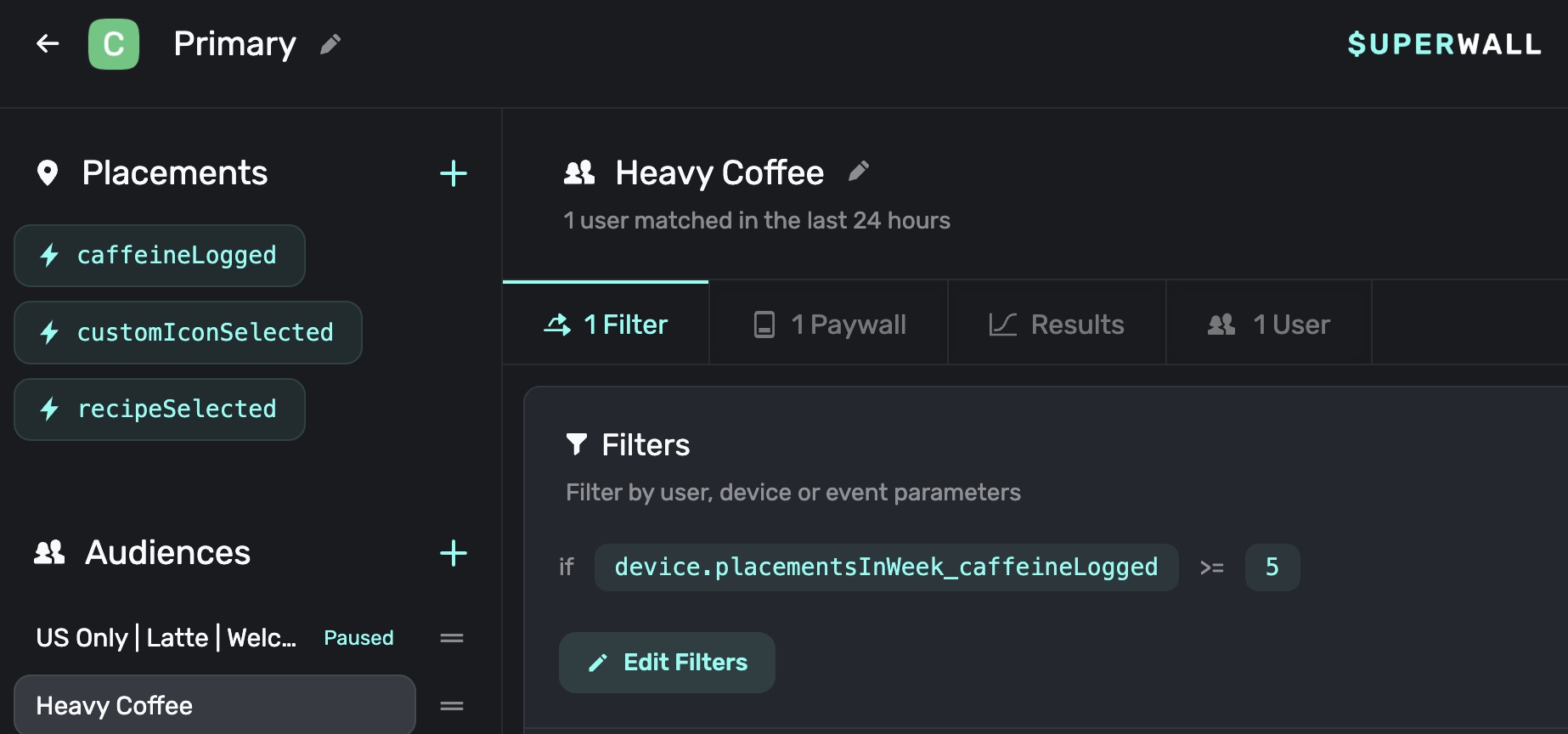 Then, filter for the event or placement you want to target. In our example, we're filtering for the caffeineLogged placement: