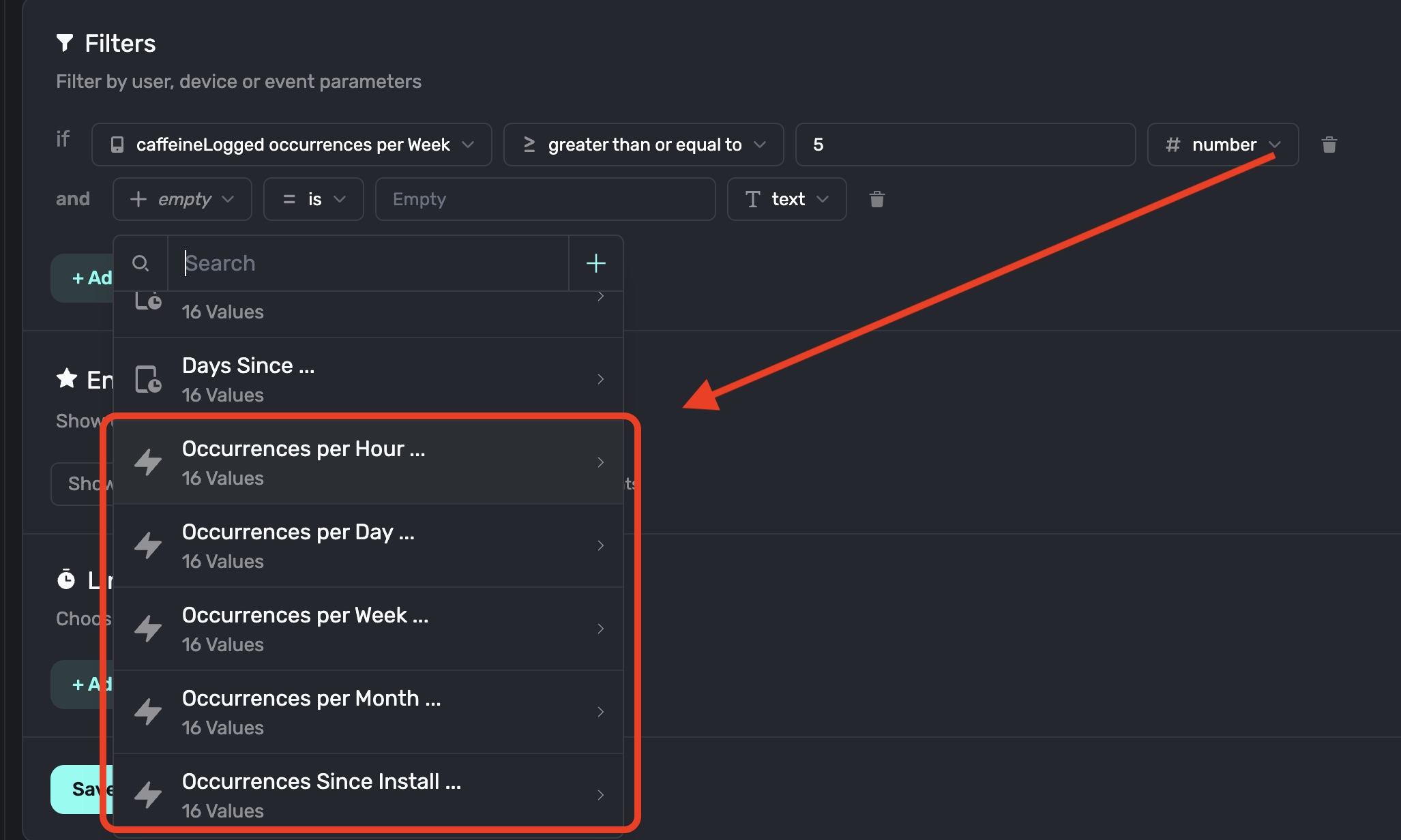 Then choose the operator you want to use and the number of times the event or placement must have occurred. In our example above, we're targeting users who have logged caffeine at least 5 times in the last week. Be sure to click the Save button to save it: