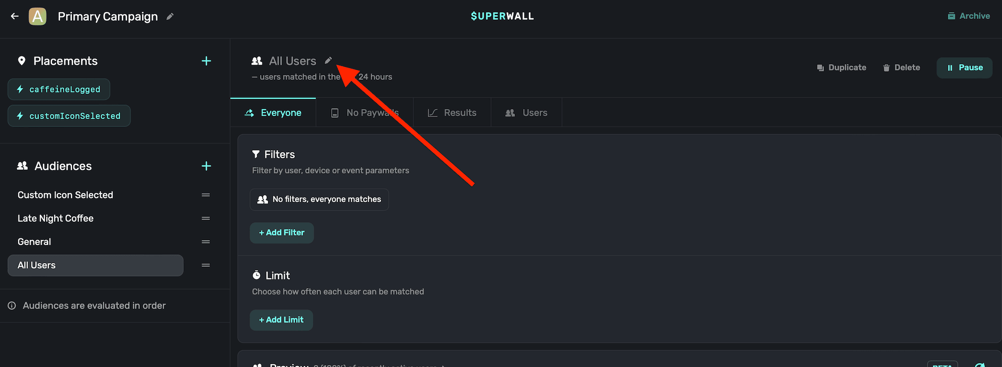 If a user logged caffeine in the morning, Superwall would first check if they matched the custom app icon audience, and then the audience for logging caffeine late at night. Since neither of those match (since they are logging caffeine in the morning, and not setting a custom icon), they'd land in the "everyone else" audience bucket.